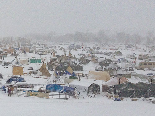 After the US Army Corps of Engineers (USACE) announced plans Friday, Nov. 25 to shut down the Standing Rock encampment on Dec. 5 for “safety reasons,” North Dakota Gov. Jack Dalrymple issued an executive order Monday, Nov. 28 calling for mandatory evacuation of the 5,000 water protectors at the Oceti Sakowin camp located on USACE lands, citing harsh weather conditions and a threat to human life. But those people trying to stop the $3.7 billion pipeline from crossing sacred Tribal sites and under the Missouri River say they aren’t going anywhere, despite the snowy winter weather that has just moved in and the threat of trespassing charges.
